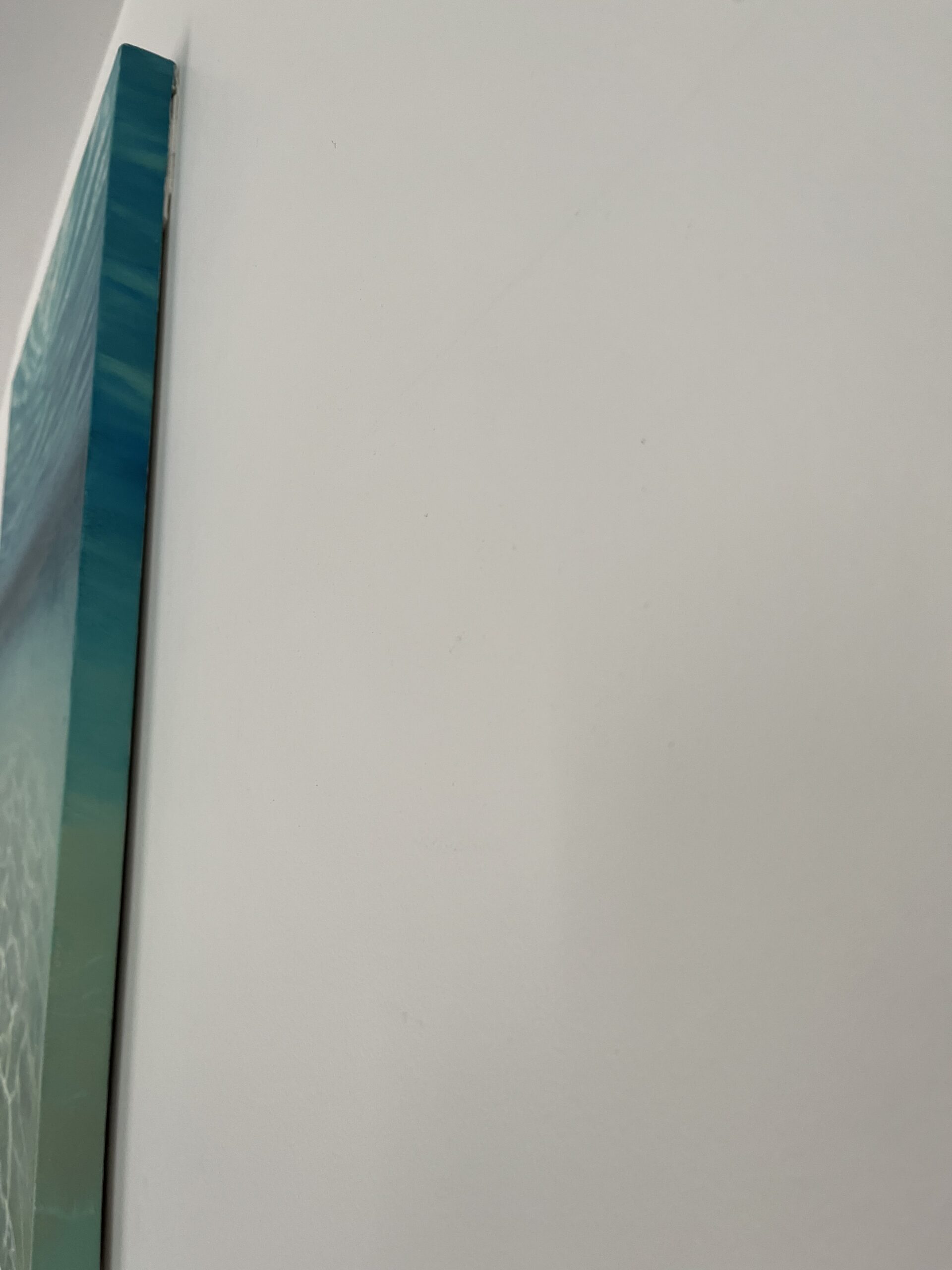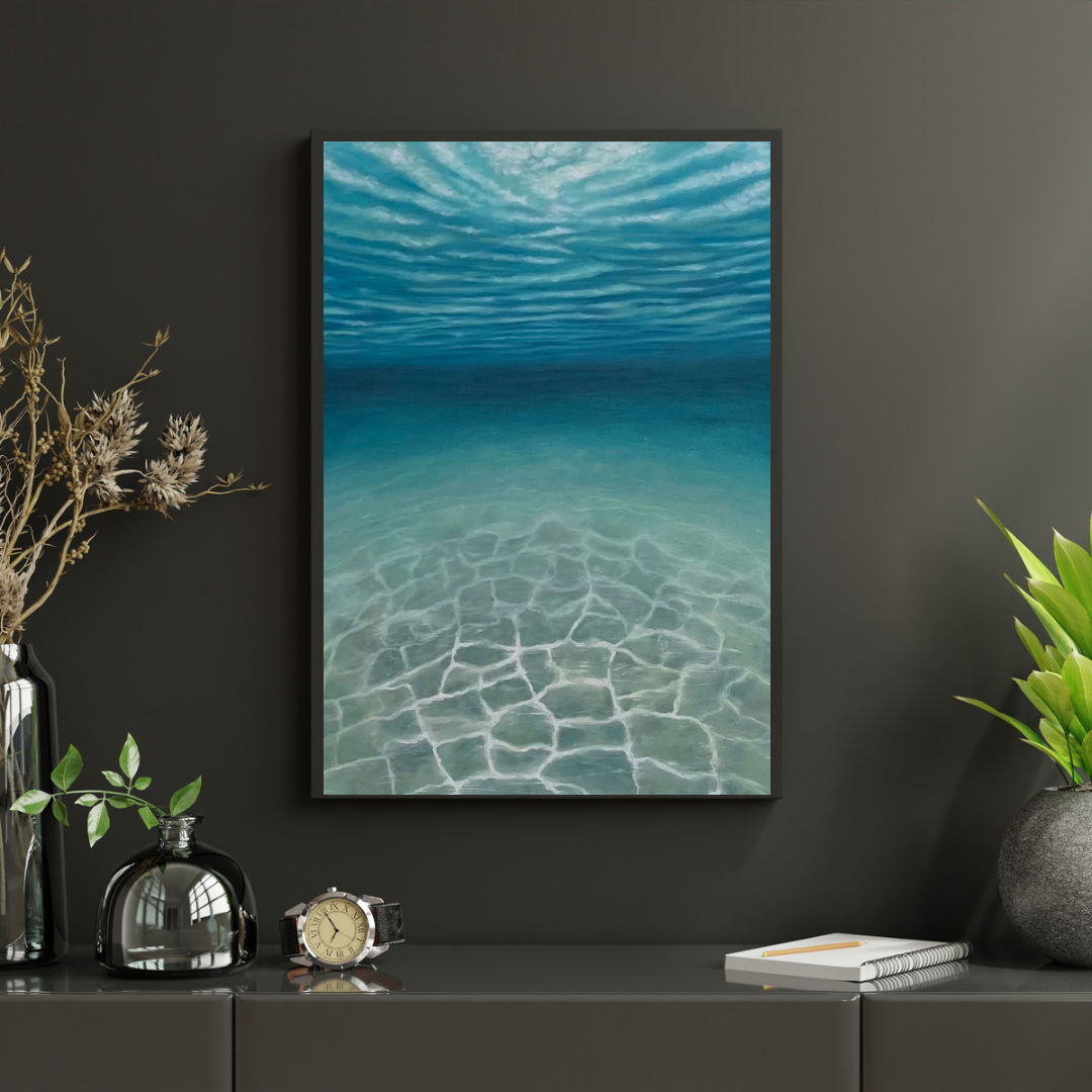 Plongez dans un instant de suspension pure. Cette œuvre capture la danse hypnotique de la lumière filtrant à travers la surface, venant dessiner des réseaux de nacre sur le sable invisible du fond. Entre le bleu profond de l’horizon sous-marin et la clarté turquoise des eaux peu profondes, cette peinture est une fenêtre ouverte sur le silence et la sérénité. Une invitation à la respiration et à la contemplation, pour apporter une présence apaisante et lumineuse à votre espace.