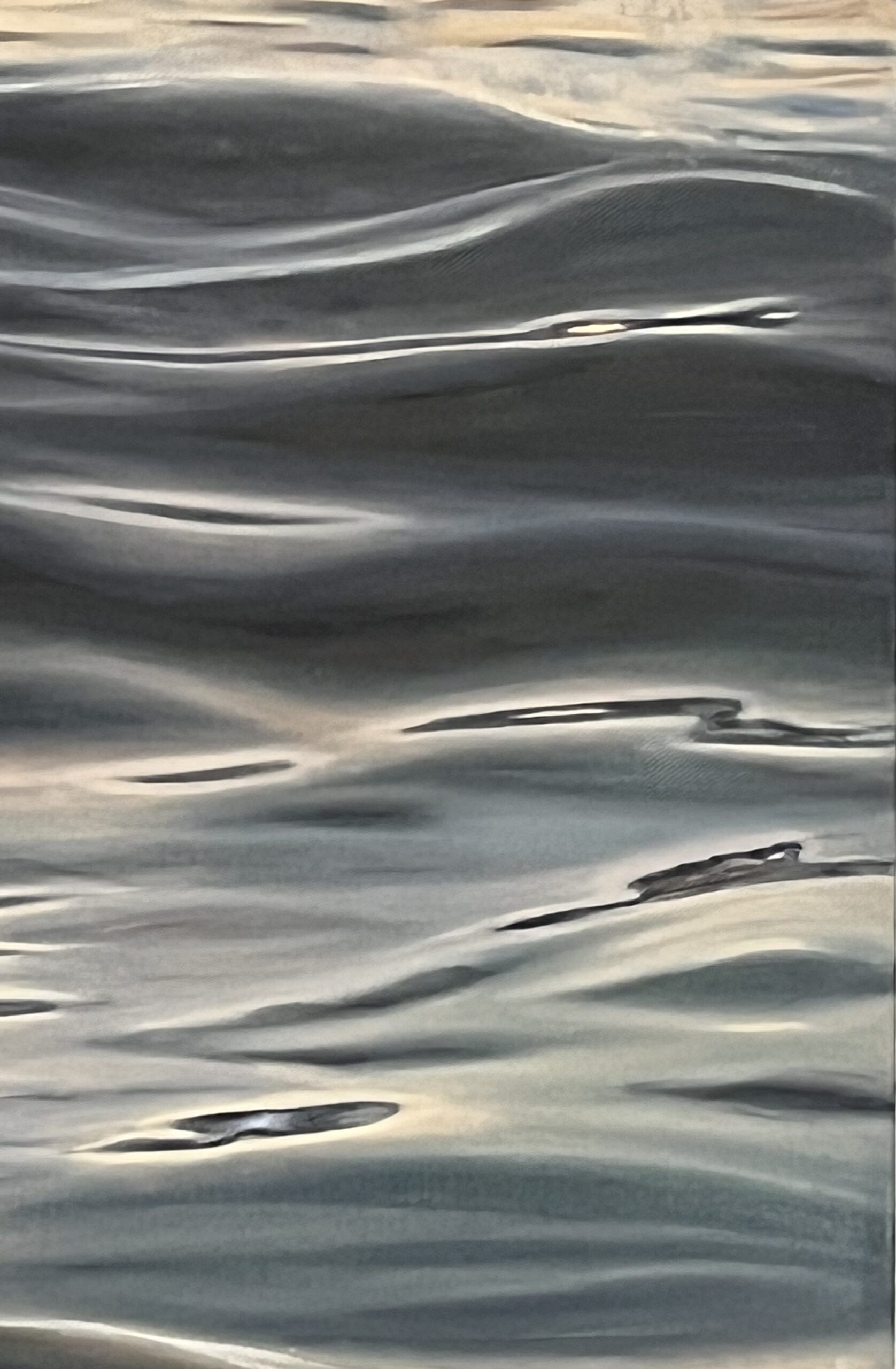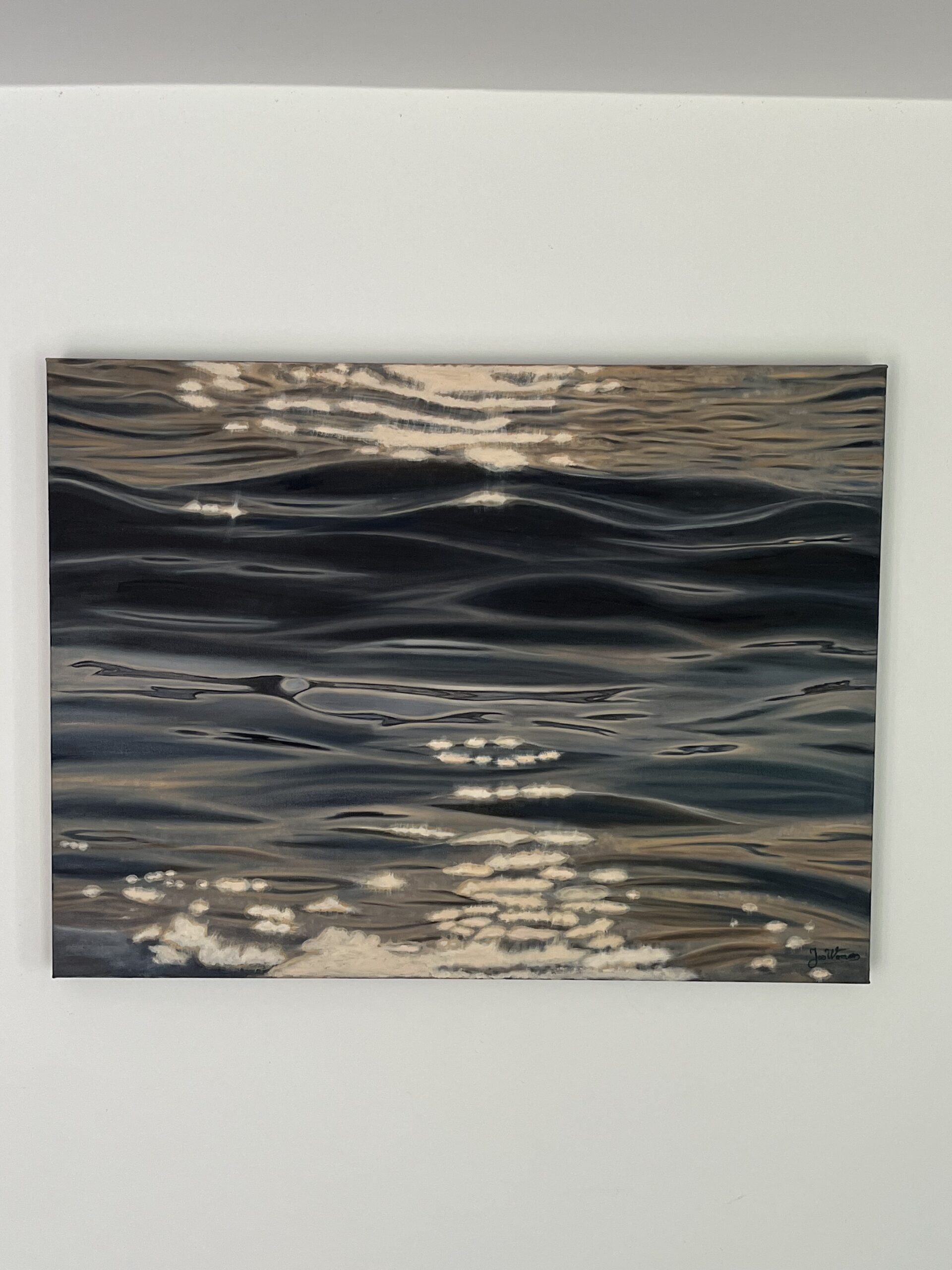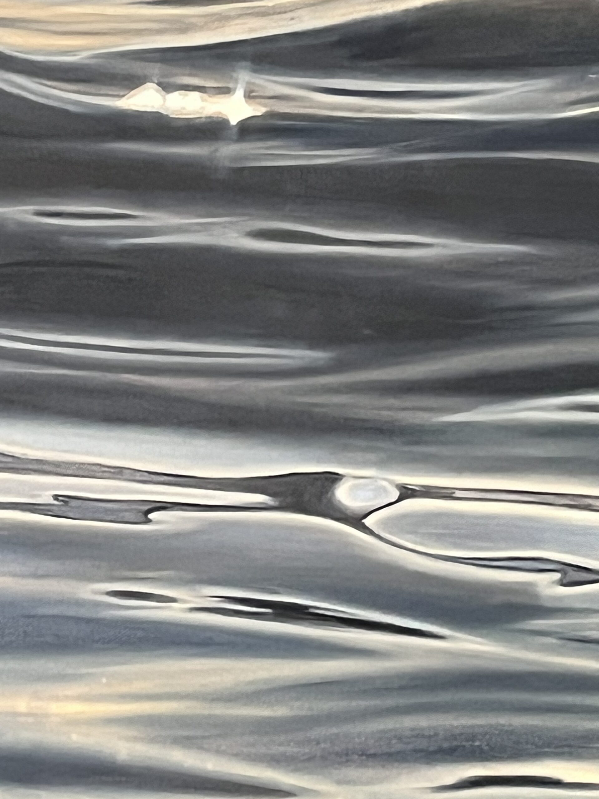 Admirez la maîtrise de la texture et du contraste dans cette peinture originale. Cette œuvre est le fruit d’un travail minutieux pour restituer le mouvement fluide et complexe de l’eau sombre. La palette de couleurs se concentre sur des tons profonds et sourds, allant de l’indigo le plus sombre à des gris-noirs froids, créant une impression d’eau dense et profonde. Par contraste, les zones de lumière sont traitées avec des pigments chauds et nacrés, imitant parfaitement les scintillements nets et éblouissants du soleil couchant ou de la lune. Le jeu subtil de superpositions donne à la toile une profondeur et une brillance uniques.