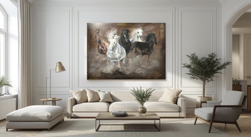 La juxtaposition des robes — l’alezan chaud, les blancs étincelants dont l’un d’un blanc pur et l’autre gris pommelé, et les noirs profonds — crée un contraste visuel saisissant qui capte instantanément le regard. La texture de leurs crinières au vent et la tension palpable de leurs muscles en plein effort témoignent d’une force brute, presque mythique, qui émane de la toile.
